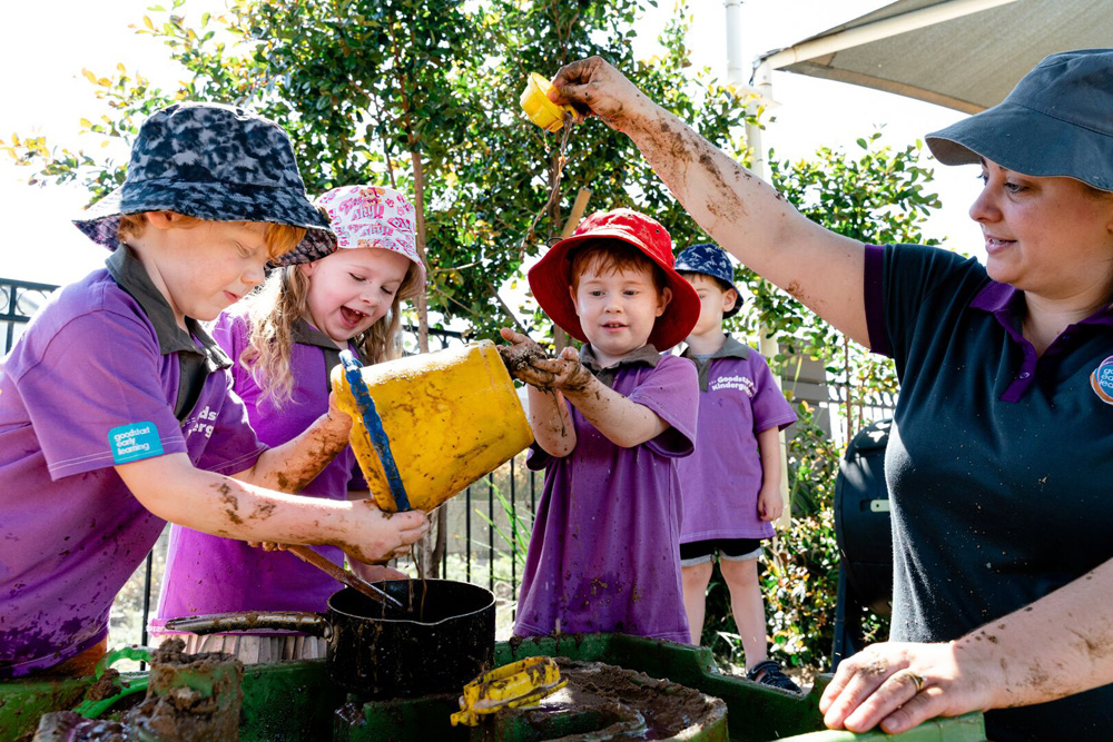The mud pit at Goodstart Glenvale Road adds a special touch to outdoor play, and Eleni explains that, “In the mud pit, the kids get messy while mixing, digging and exploring dirt and water.”