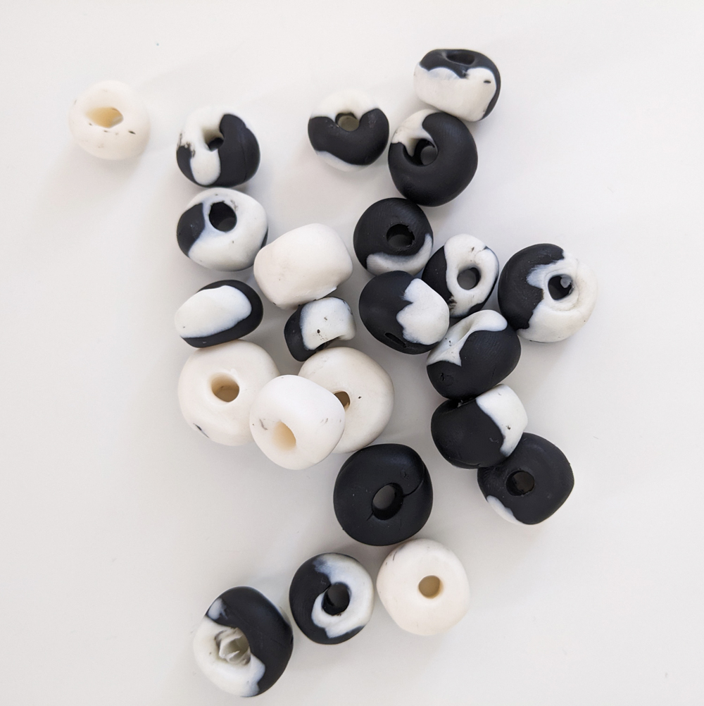Fimo is a fun material to make beads out of, because you can swirl black and white clay together, shape it into balls, then bake until hard.