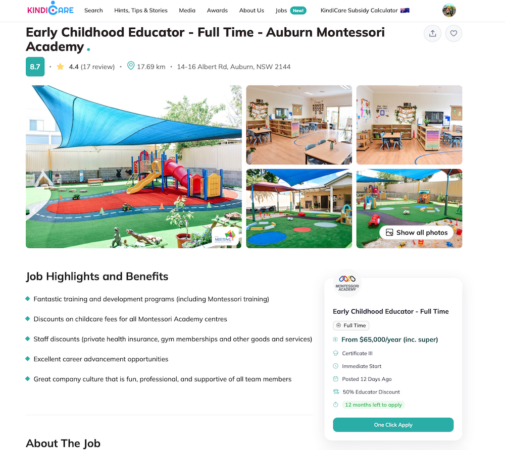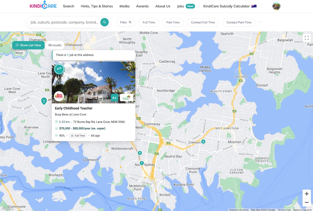 - Workplace Transparency - every job advertised on the KindiCare Jobs marketplace is linked to the exact location of the centre or workplace for the role being advertised. Job seekers for the first time can also view jobs in a map view showing the job opportunities that are closest to them as well as transport and commuting options.
