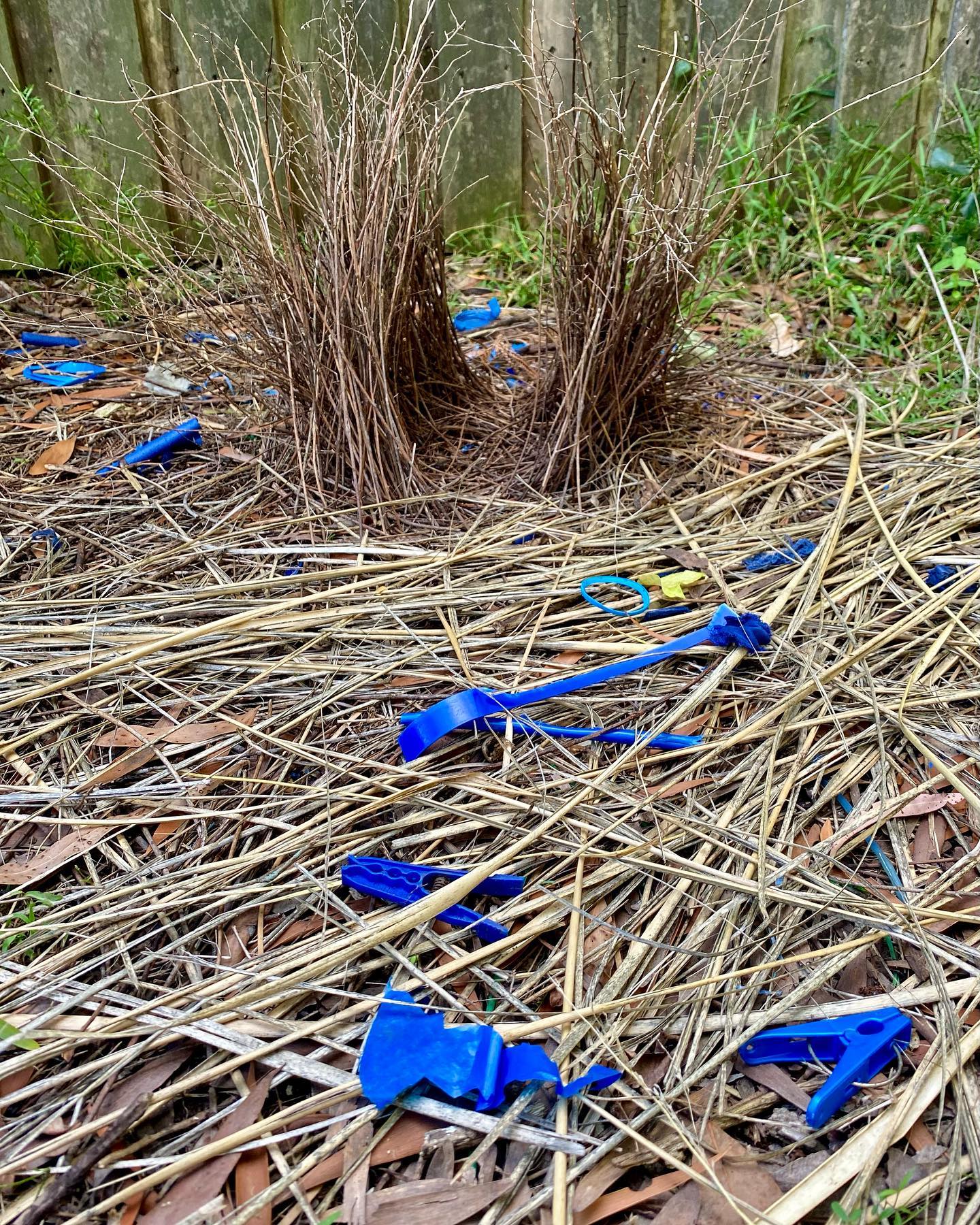 The bowerbird’s weird and wonderful behavior is captivating and charming, and they reflect us humans in the way they dance and adorn their bower with treasures, which unfortunately are often pieces of rubbish or single use plastics.
