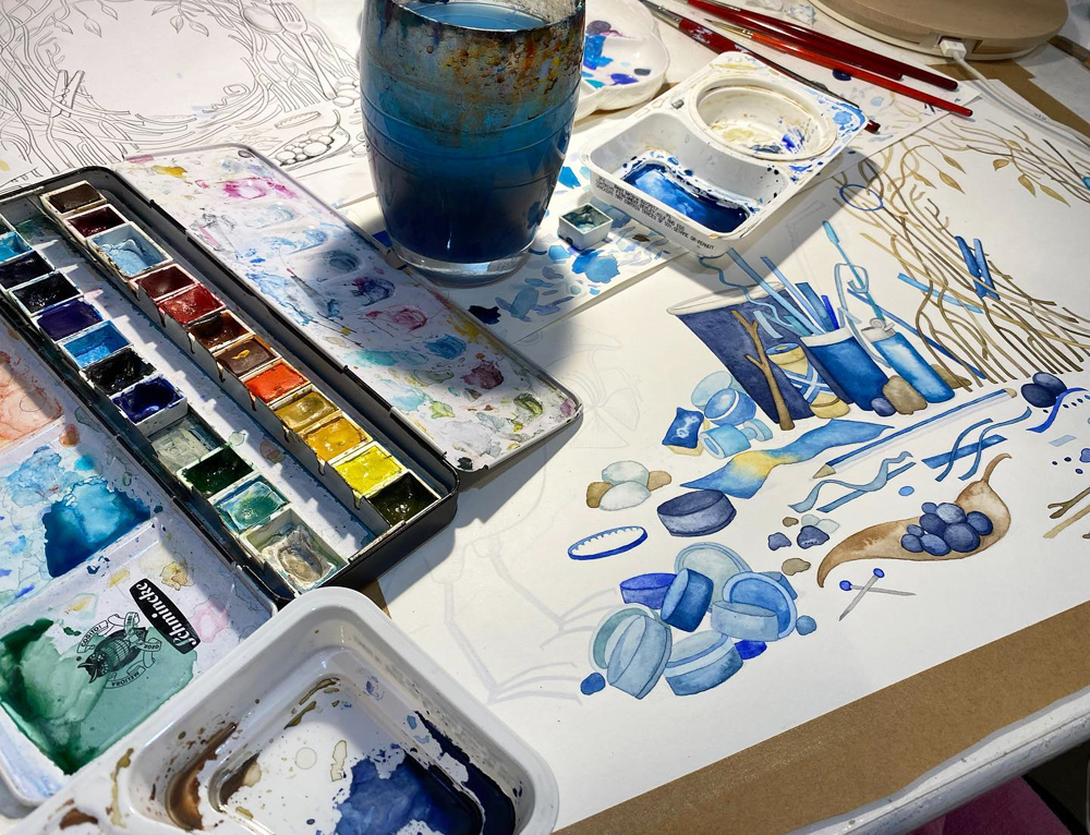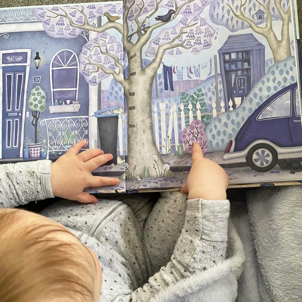 I created the illustrations in watercolour, using a mixture of traditional and digital techniques, and it was fun to include a look-n-find activity, where young readers can find all the blue items in the endpapers of the book.