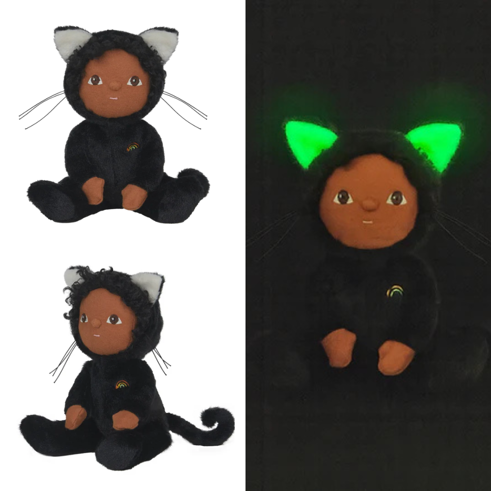 This comforting kitty is cloaked in velvet, with glow-in-the-dark ears; and when dawn breaks, this Dinky Dinkum Doll is up for daytime adventures too.