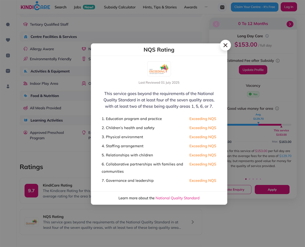 A service rated Exceeding NQS across all seven quality areas, with a KindiCare Rating of 9.7, will obviously go to the top of your shortlist.