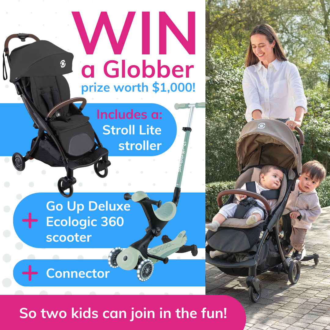 Thanks to Globber Australia, one KindiCare reader will win a Stroll Lite stroller, Go Up Deluxe Ecologic 360 scooter and a connector – valued at more than $1,000!