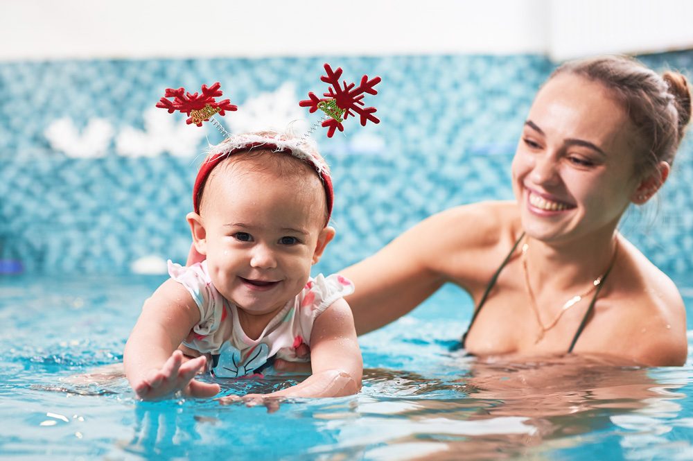 Whether you’re at a pool party, planning a beach Christmas, or just want to get wet, it’s fun to walk through shallow water, make a splash, and play gentle chase games with your little one.