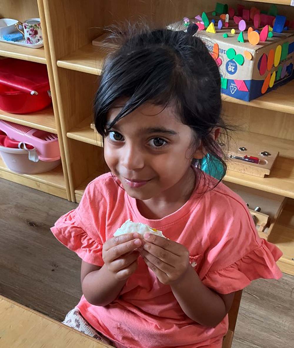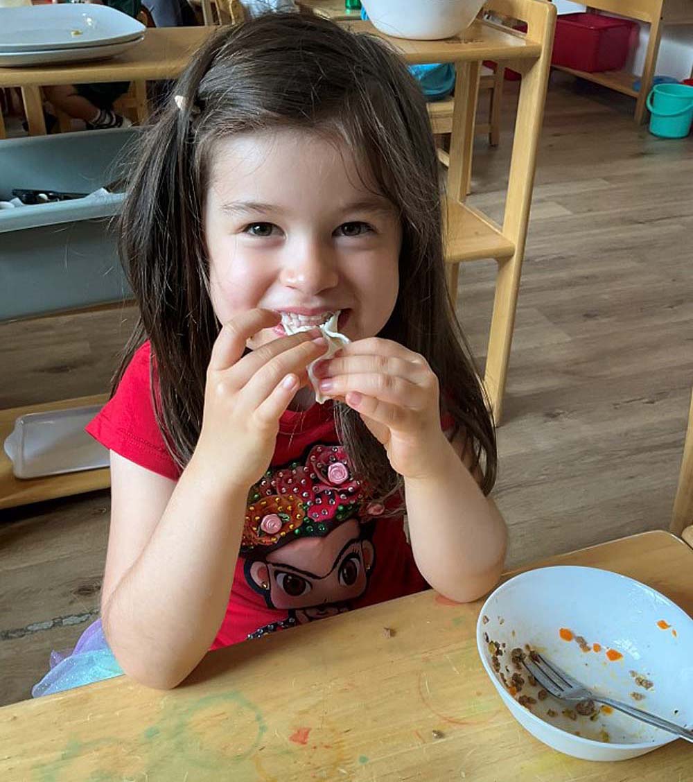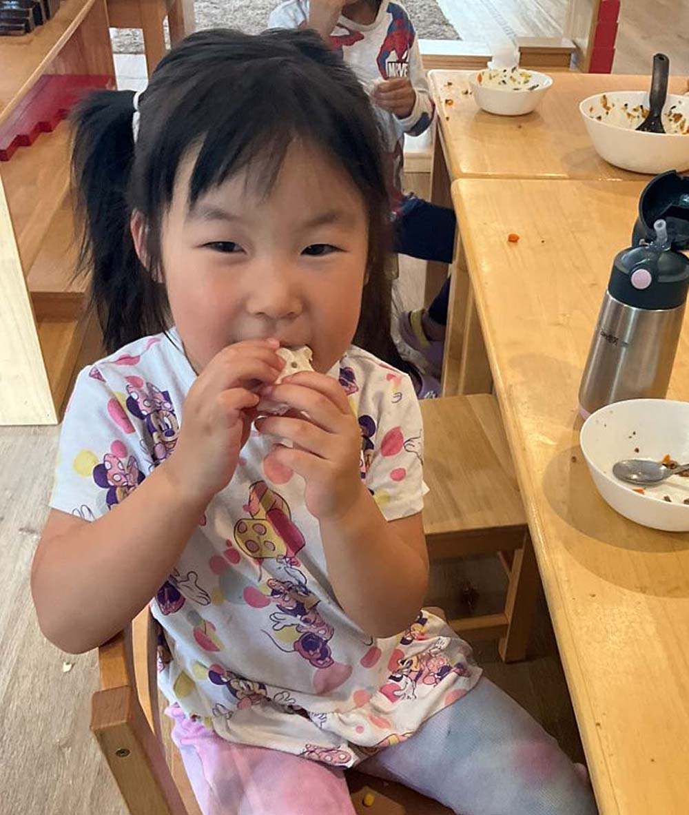 Stella explains that, “During morning group gatherings, children are given the choice to greet their peers in either English or Chinese, and over time they develop practical language skills that they can apply in everyday life, such as understanding simple phrases like ‘xi shou’ (washing hands) and ‘chi fan’ (eating meals).”