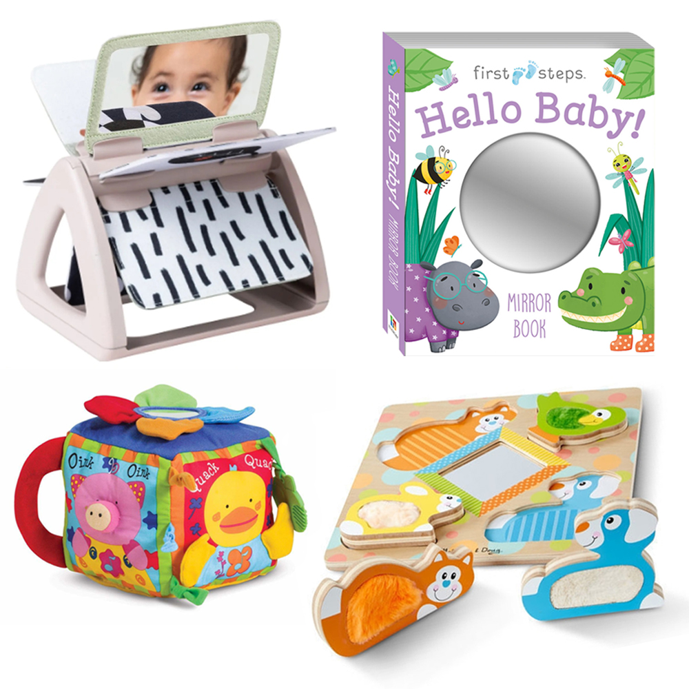 Good product designers know that mirrors help to support littlies’ sense of identity, self-awareness and social-emotional development, so there are lots of toys and books with reflective features.